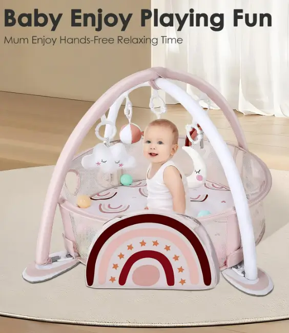 The Dearlomum 4-in-1 baby play mat transforms from a tummy time gym into a ball pit, offering long-lasting value as your baby grows. It includes 30 soft balls and five sensory toys that encourage learning, movement, and early development. The colorful rainbow design creates an engaging play space that holds your baby’s attention and supports both independent and guided play. With its soft padding and versatile setup, it’s a practical and fun gift for newborns through toddlerhood