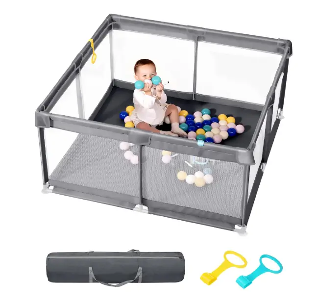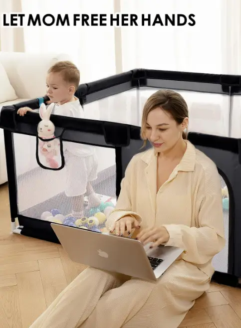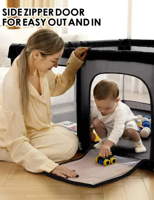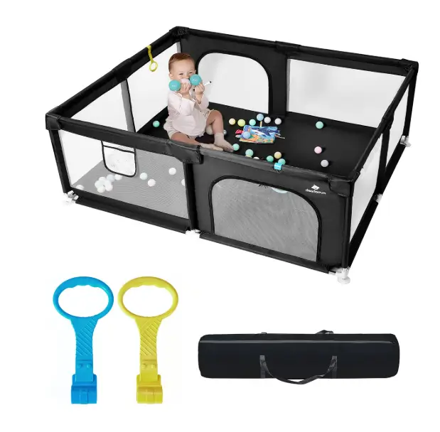 The upgraded Dearlomum baby playpen offers a spacious 71″x59″ area, giving toddlers plenty of room to play, crawl, and explore safely. Its thickened steel pipes and sturdy soft mesh create a strong, stable structure that parents can trust during daily use. The built-in gate and included toys add convenience and fun, making it easy for caregivers to interact with their child without lifting the entire pen. Designed as a reliable activity center, it provides a secure, comfortable space for toddlers while giving parents valuable peace of mind