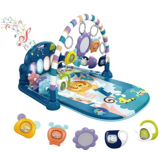dearlomum Baby Play Mat Gym, Funny Play Piano Tummy Time Activity Mat with 5 Infant Sensory Toys, Music and Lights, Boy & Girl Gifts for Newborns 0 to 3 6 9 12 Months